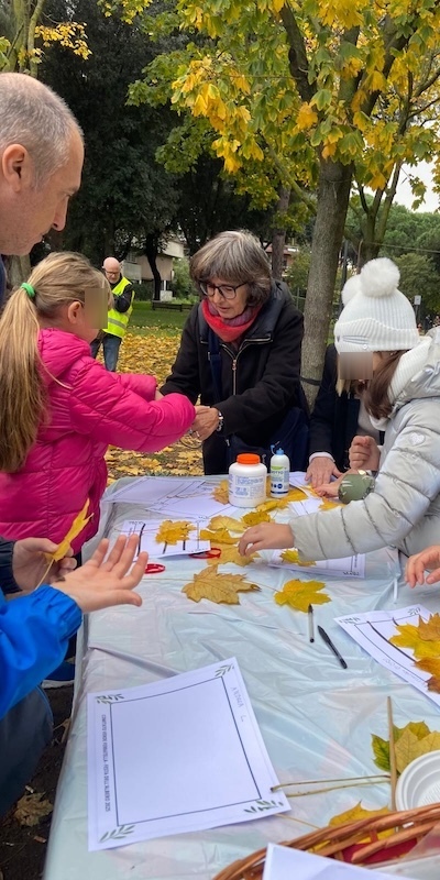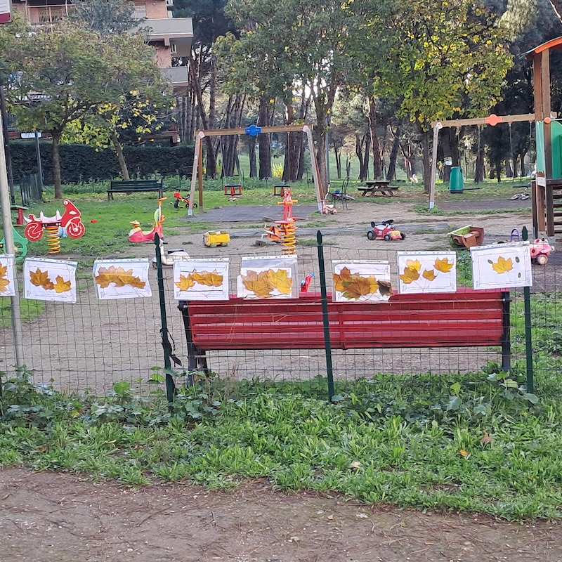 Tutti i bambini preparano una scheda con le foglie raccolte nel prato che poi appendono alla recinzione del parco giochi. La festa finisce con il gioco della pignatta riempita di piccoli oggetti e di dolciumi.