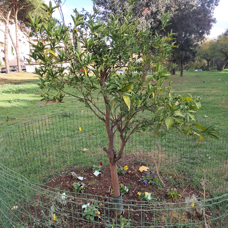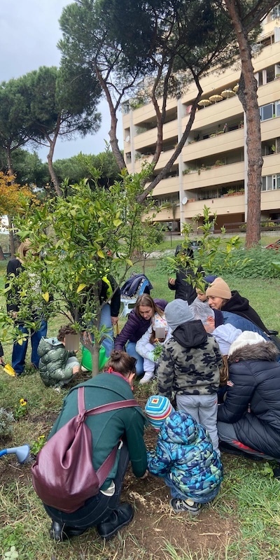 Sabato 22 mattina il Comitato Verde Ferratella ODV incontra i bambini del quartiere nel Parco Agnelli, ai tavoli vicino all’area giochi. I bambini si dedicano alla creazione di un aiuola intorno ad uno degli agrumi, scelgono la piantina e con l’aiuto di una volontaria la posizionano nel terreno e la innaffiano.