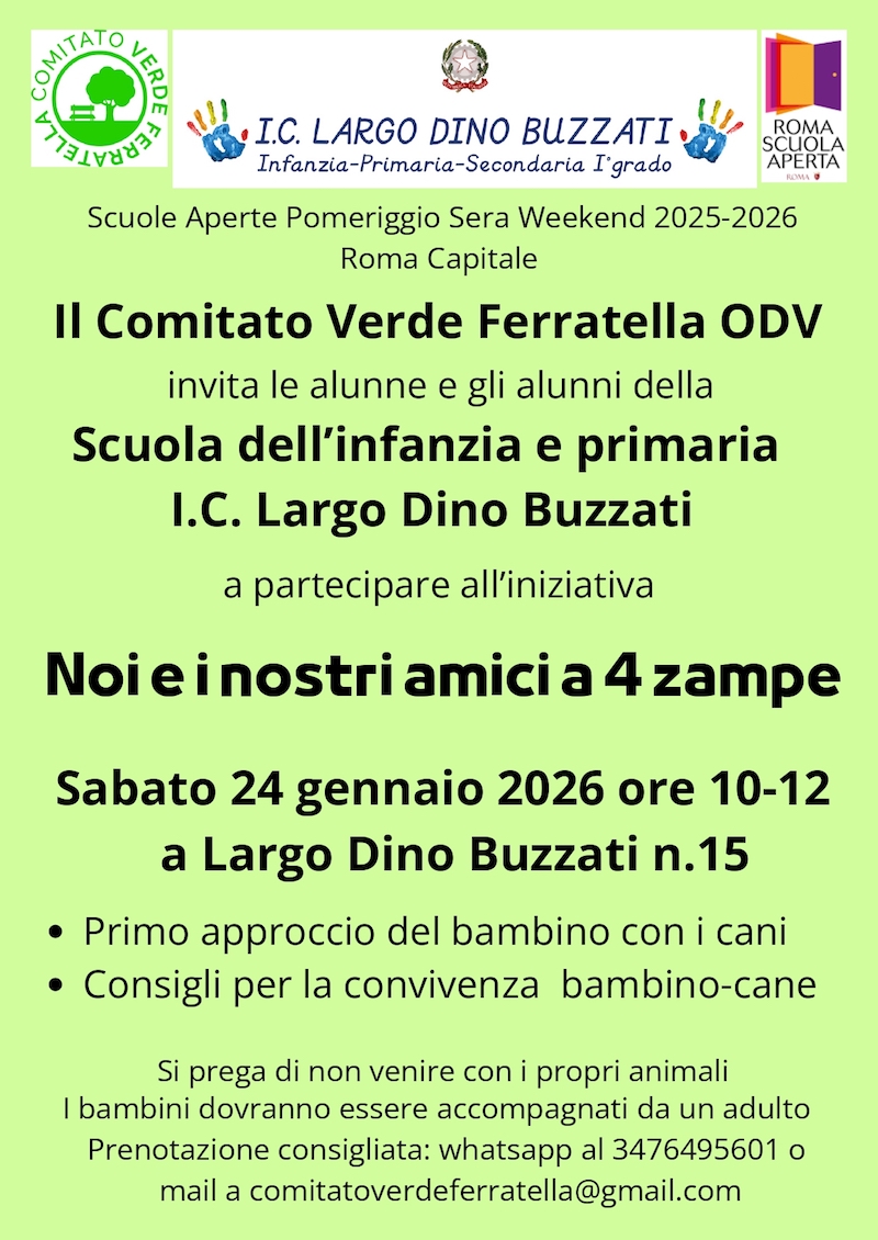 Incontro dei bambini della scuola dell’infanzia, plesso Buzzati e Quasimodo, e primaria dell’I.C. Largo Dino Buzzati con l’educatrice canina Vincenza Chirigu. L’incontro spiega come comportarsi sia nel primo approccio che nella convivenza tra bambino e cane.
